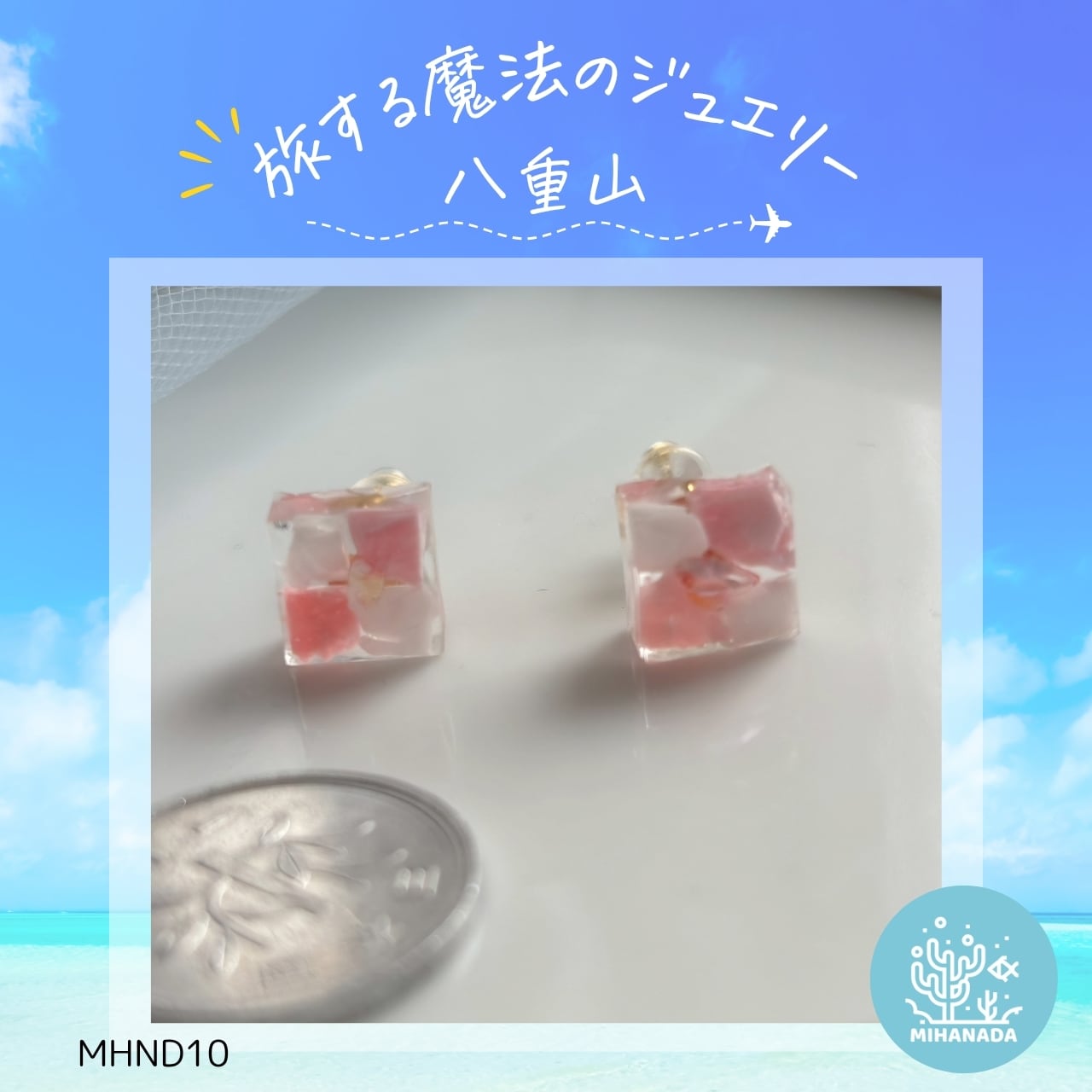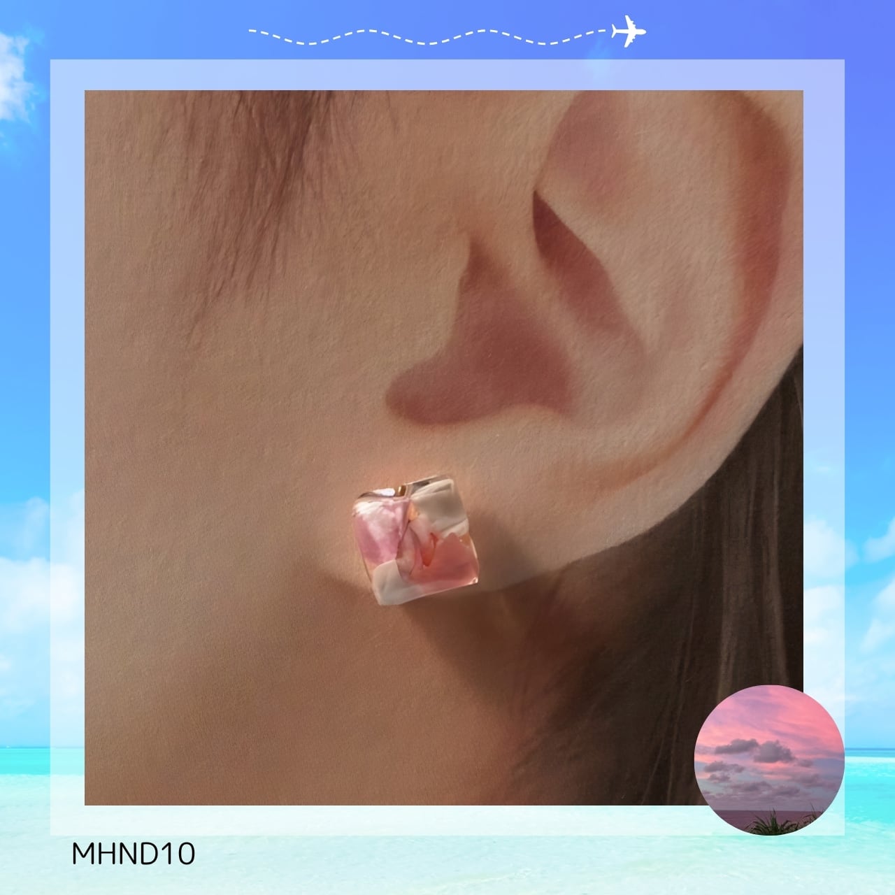 “ニライカナイの夕暮れ”を思わせるピンクのスクエアピアスに仕立てました。